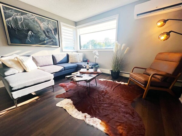 Our open-concept living room and kitchen offer a warm, rustic farm-style feel with plenty of natural light. The kitchen comes stocked with all the basics, so you can whip up a hearty breakfast, prepare family dinners, or simply reheat your favorite takeout from the neighborhood.