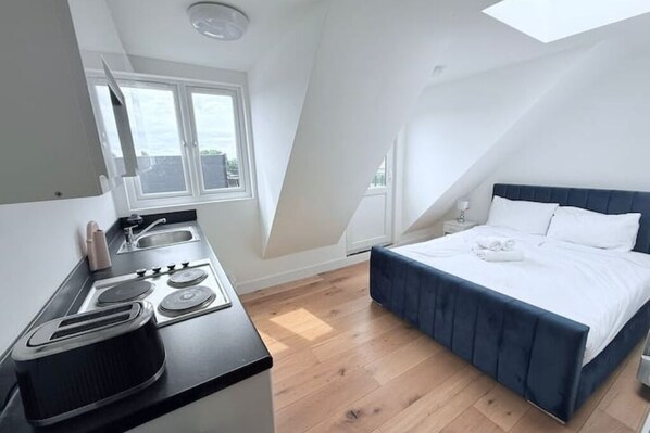 Flat 9 is a modern and cozy studio located on the third floor of Golders Green Road. It features a comfortable sleeping area, a sleek private bathroom, and a compact kitchenette equipped with a stove, fridge, microwave, kettle, and all the essential cookware. Ideal for solo travelers or couples, this quiet and functional space offers a convenient base just a short walk from Golders Green Station, shops, and cafés. Enjoy a simple, comfortable stay with easy access to central London.