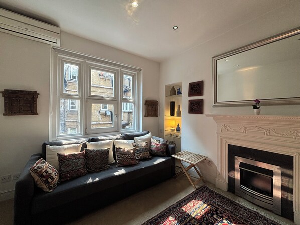 The bedroom is a sanctuary of comfort and style. The comfortable double bed, dressed in hotel-quality linen, guarantees a restful night's sleep while the floor-to-ceiling wardrobes offer ample storage space and ensure a clutter-free stay. A large, bright window opens up the space, offering picturesque views of the London street below. The bedroom is also equipped with a handy air conditioning unit and heating for your comfort and a keyboard available for guests to use and enjoy.
