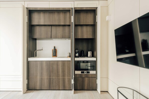 Cook up something in your sleek kitchenette, complete with a microwave, fridge, hob, kettle, and a few thoughtful essentials like olive oil, salt, pepper, tea, and coffee.