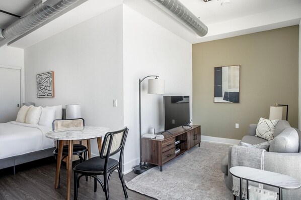 Building amenities may have an extra cost. This Blueground apartment has flexible lease options, allowing you to book it for one month, a year, or more. Pets are welcome, though weight limits and breed restrictions apply and may incur fees. Parking is offered based on availability and is subject to a fee. We take great pride in ensuring every photo displayed is shot in our own units with our actual furnishings. That said, we regularly refresh our decor and furniture arrangement, which may differ from what’s pictured.