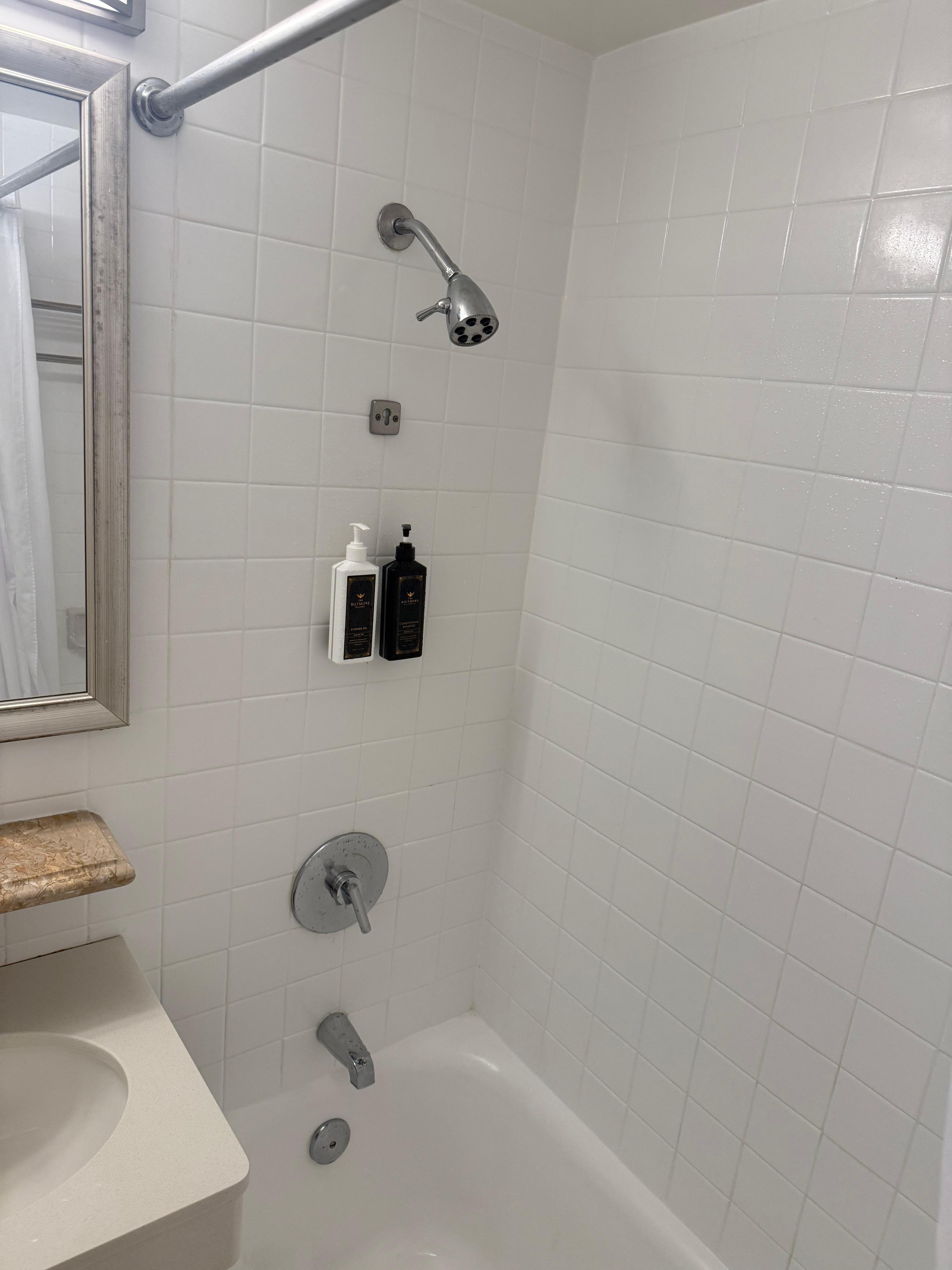 Badezimmer mit Duschwannen und kostenlosen Toilettenartikeln