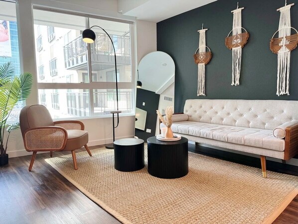 The living room is furnished with a comfortable sofa bed and an artsy accent chair with an ottoman, perfect for relaxing after a day of exploring. There is also a flat-screen smart TV with FREE streaming services, allowing you to catch up on your favorite shows or movies.
