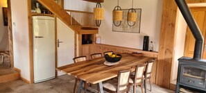 - large living room of 50 m² with open kitchen, comfortable living room with a wood stove.