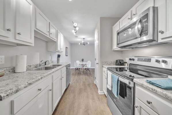 The spacious, fully stocked kitchen boasts an oven, dishwasher, refrigerator, microwave, dining table, and all the essentials—pots, pans, plates, cutlery, and dish towels—for easy meal prep and dining.