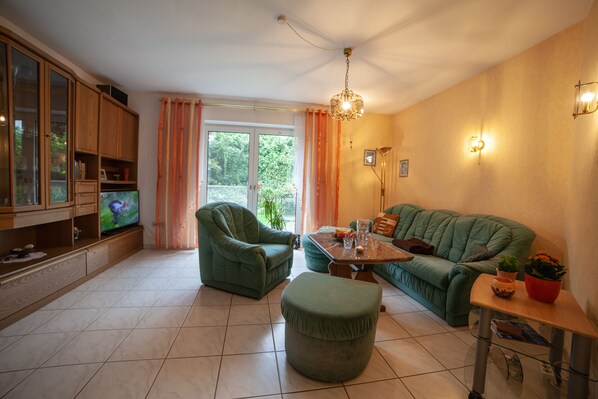 Die Unterkunft hat 1 Schlafzimmer mit 2 Betten (optional Kinderreisebett), sowie bei Bedarf (als Aufbettung) ein mobiles Klappbett im Wohnzimmer. Die Küche ist komplett eingerichtet, das Bad mit Dusche/ WC, Wohnzimmer mit Sat-TV und Radio, Grillmöglichkeit im Garten.
