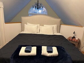 Upstairs there's a loft bedroom with a half bathroom and claw foot tub. It has a king size bed.