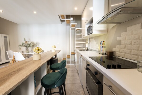 The open kitchen, integrated into the living room, is fully equipped with all necessary appliances, facilitating meal preparation for both everyday and special occasions. Its design optimises space and includes additional storage areas, making it practical and functional.