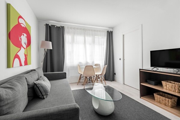 This flat is designed with an open floor plan. The living room features a plush sofa, a smart TV to watch all your favourite shows via multiple streaming options, and a dining table for four.