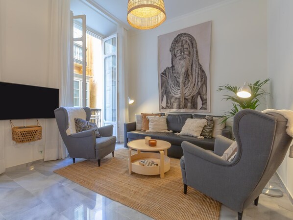 Wonderful apartment with high ceilings and beautiful balconies in a 19th century building, located in the historic center of the city, very bright and fully equipped, has an elevator, free WIFI, air conditioning (hot/cold). It has two small patios and also a large window resolved with the type of wooden closure that is traditional in Malaga. The location is extraordinary, in a pretty street next to the Carmen Thyssen Museum and a minute's walk from the famous Calle Larios.