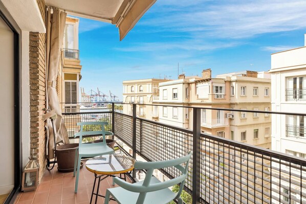 A highlight of the property, this wide balcony is furnished with a table and chairs. Located on one of the building's highest floors, it offers a peaceful spot to enjoy spectacular views of the Málaga Port and the city skyline.