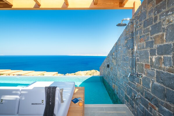 The pool terrace features a private, heated, 35 m2 infinity swimming pool with hydromassage (1,30 m deep) and unobstructed sea vistas, while being equipped with 1 double daybed, outdoor sofa and a hanging chair, as well as an outdoor shower for your comfort. Furthermore, the outdoor dining area under the shade of a pergola is ideal for al fresco dining. Finally, the Villa is fully fenced, offering total privacy and has its own entrance and private parking space inside the Villa premises with a gate. The pool heating system can be used with an additional daily charge for the entire stay and it requires at least one week advance notice.