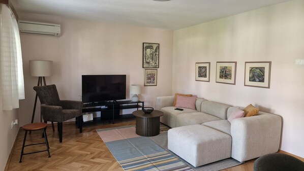 Im Wohnzimmer gibt es eine Zweisitzer-Couch und einen Sessel, es hat SAT-TV und WI-FI. Ein Schlafzimmer hat ein Doppelbett und das andere hat zwei Einzelbetten.