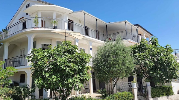 Malinska, Ortsteil Sveti Vid-Miholjice. Die Ferienwohnung befindet sich auf einem 300 qm großen, geschlossenen Gartengrundstück mit Wiese, Blumen und Sträuchern. Der Vermieter wohnt ständig im Haus, nutzt jedoch einen separaten Eingang. Die Zufahrt erfolgt über eine Nebenstraße (asphaltiert). Parkplatz (für 1 Pkw) auf dem Grundstück.