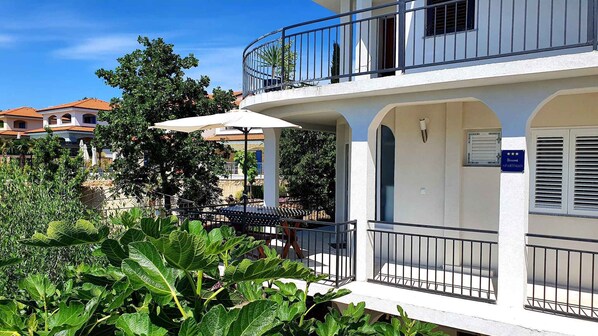 Lage Malinska, Ortsteil Sveti Vid-Miholjice. Die Ferienwohnung befindet sich auf einem 300 qm großen, offenen Gartengrundstück mit Wiese und Sträuchern. Der Vermieter wohnt ständig im Haus, nutzt jedoch einen separaten Eingang. Die Zufahrt erfolgt über eine Nebenstraße (asphaltiert). Parkplatz (für 1 Pkw) auf dem Grundstück.