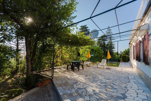 Lage Malinska, Ortsteil Malinska. Die Ferienwohnung befindet sich auf einem offenen Gartengrundstück mit Sträuchern und Bäumen. Der Vermieter wohnt nicht im Haus oder auf dem Grundstück. Die Zufahrt erfolgt über eine Nebenstraße (asphaltiert). Parkplatz auf dem Grundstück.