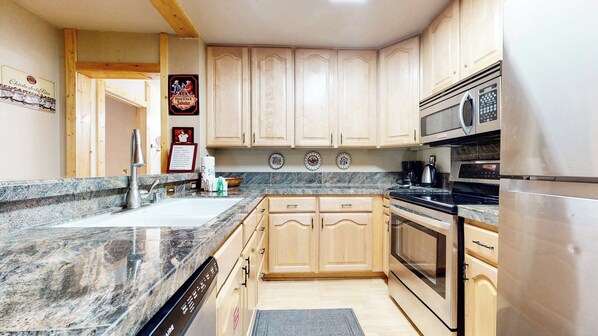 The home’s open living space has a classic mountain vibe with cozy furnishings and exposed wood detailing. The wood burning fireplace will warm you up as you wind down on the large and comfortable couches which face a tv with cable access. Through sliding glass doors, enjoy views of an open outdoor area dotted with tall pines, or head through the doors onto your private deck to enjoy some fresh mountain air.