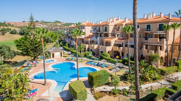 Upstairs, you’ll find both bedrooms, each with its own en-suite bathroom. The master bedroom also benefits from a private terrace with lovely views over the Duquesa Golf Course and the communal swimming pool.