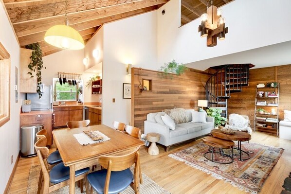 Recently upgraded and beautifully furnished throughout, this spacious and private two-bedroom cabin features an open floor plan with a modern kitchen, dining area, and a living room with cozy wood-burning fireplace.