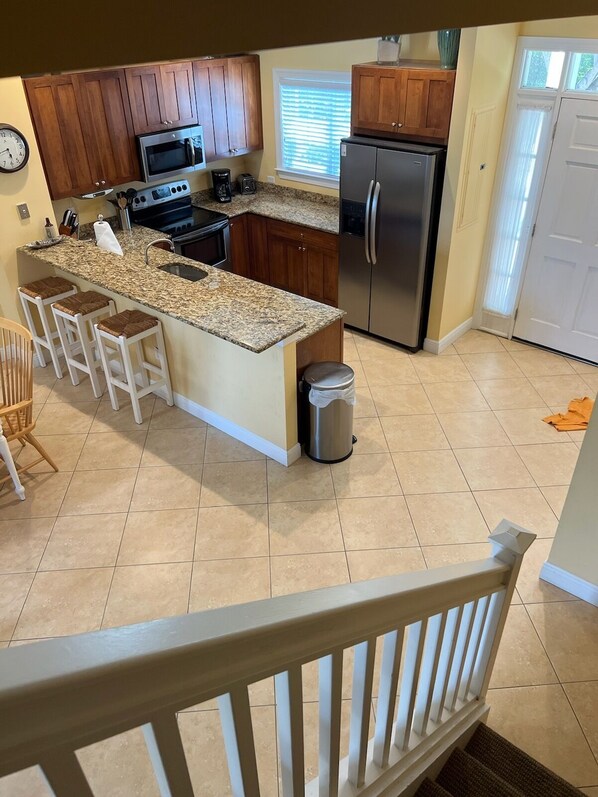 This over 1600 sq/ft three bedroom, two and a half bath townhome is the perfect way to enjoy the Florida Keys. Each bedroom has its own television, with a 75" flat screen TV in the living room. The Townhome has direct sunset views looking out to the Gulf of Mexico, which can be enjoyed from the porch or upper balcony. Close to your back porch is your own private boat dock for boats up to 31'. The kitchen is fully stocked with all you will need to dine in and you can easily grill out on one of several charcoal grills located near the deeded boat slip. The townhome has everything you will need for your stay. Bring your personal items and enjoy.