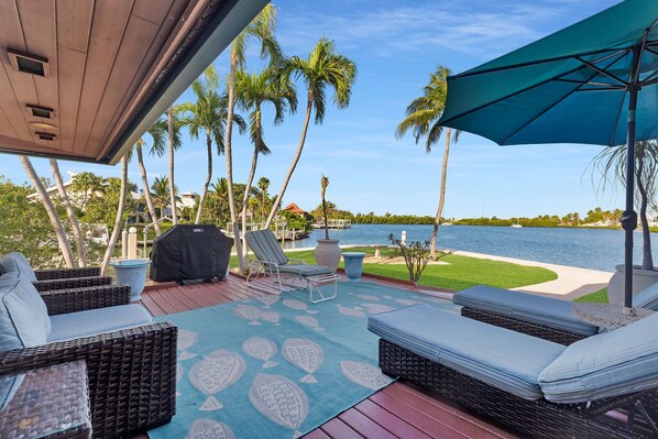 At “Angler’s End”, you will find five bedrooms and three full bathrooms that are spacious with large closets and ample storage. The master bath has been redesigned to include a walk-in tub and separate shower area. Two bedrooms have a private outdoor patios with views of the water and access to the large lawn. There are 5 new flat screen TVs in the home with WiFi and internet accessible throughout the residence.