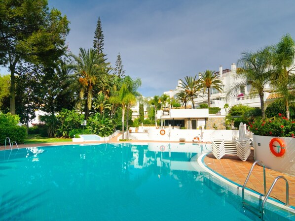 Außenbereich: Terrasse, Gemeinsamer beheizter unbeheizter Pool, Kinderbecken, Gemeinsamer Garten, Garagenparkplatz, Parken auf der Straße.