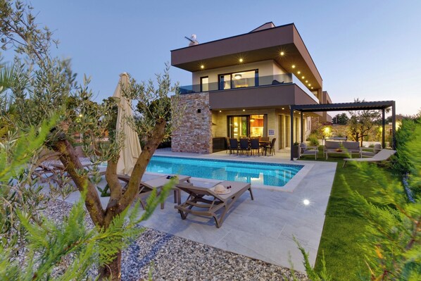 Die Villa Bavigo und die Villa Pieron sind neue, moderne Ferienvillen in der Nähe von Pula, die eine perfekte Kombination aus Luxus und Komfort bieten. Diese beiden Villen, die nur durch eine Rückwand miteinander verbunden sind, gewährleisten Privatsphäre für jede Unterkunftseinheit mit eigenem, abgeschlossenen Grundstück.Beide Villen zusammen bieten 8 Schlafzimmer und 8 Badezimmer, perfekt ausgestattet für bis zu 16 Personen. Jede Villa verfügt über ein geräumiges Wohnzimmer mit voll ausgestatteter Küche, einen Außenbereich mit privatem Pool, Whirlpool und Sauna sowie zusätzliche Annehmlichkeiten wie Tischtennis und Tischfußball zur Unterhaltung.Das Erdgeschoss jeder Villa besteht aus einem zentralen Wohnbereich mit Zugang zur Terrasse, einem Essbereich, einer modernen Küche und einem komfortablen Schlafzimmer mit Doppelbett, TV und eigenem Bad. Im ersten Stock jeder Villa befinden sich drei weitere Schlafzimmer mit Doppelbetten, jeweils mit eigenem Bad und Zugang zur Terrasse, während die Wellness-Oase mit Whirlpool und Sauna besonderen Genuss und Entspannung bietet.Im Außenbereich erwarten Sie zwei private Pools mit Wasserfall (auf Wunsch können die Pools auch beheizt werden, was außerhalb der Saison ideal ist), bequeme Gartenmöbel, eine überdachte Ess­terrasse, Liegestühle und Sonnenschirme. Für Feinschmecker gibt es außerdem eine Sommerküche mit Grill, ideal für gemeinsame Momente im Freien. Der vollständig eingezäunte Hof jeder Villa gewährleistet Privatsphäre und bietet insgesamt vier private Parkplätze.Hinweis: Gruppen von jungen Leuten sind nur nach vorheriger Absprache erlaubt.Buchen Sie eine unserer Villen oder beide zusammen und genießen Sie die schönste Zeit des Jahres bei uns! Entfernungen: poststation 400m, erste hilfe 11000m, diskothek 13000m, hotelschwimmbad 13000m, tankstelle 11000m, restaurant 3000m, lebensmittelgeschäft 400m, zentrum 600m, meer 8500m, strand 8500m, flughafen 9000m.