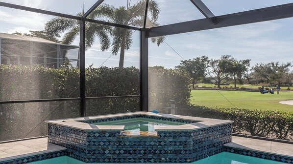 Lovely Golf Course location and view on a very quiet street with SW exposure. Three bedroom two bath home with pool and spa. This home really captures the views of the golf course with the panoramic screen enclosure. You will spend most of your time outside as this lanai, pool, and spa are perfect for relaxing poolside or grilling. There is ample seating as well as a dining table to eat meals outdoors.