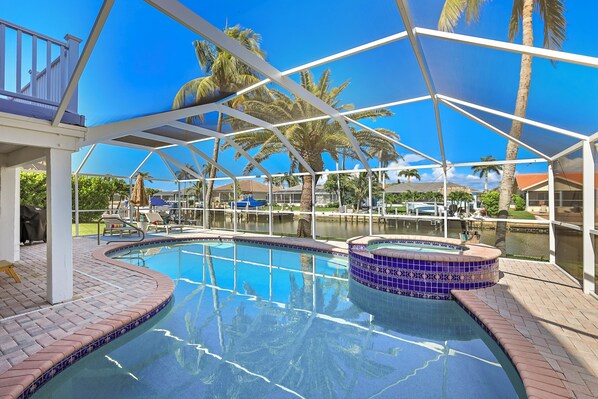 Step outside onto your very own spacious screened-in lanai area and feel the warmth of the sun on your skin as you lounge by the heated pool or soak in the hot tub. For boating enthusiasts this home has a private boat dock available for your use, giving you indirect access to the water for a day of fishing, cruising, or exploring the island’s beautiful coastline. Additionally, a floating dock is conveniently at the house which perfect for launching the two kayaks that are provided. Enjoy a nice peaceful paddle through the beautiful waterways of Marco Island.