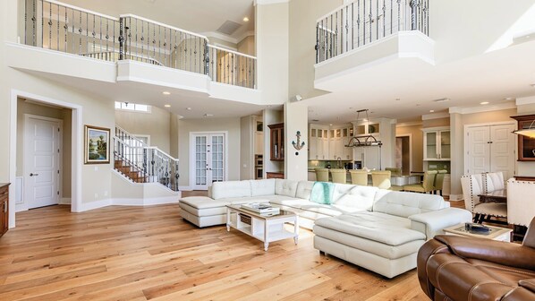 This expansive home has seven bedrooms and five bathrooms. It is perfect for a family getaway or family reunion. As you walk in, you are greeted by the open living room with a leather sofa and love seat and a large flat-screen TV. The kitchen area is great for gatherings, with modern appliances, a huge center island with eight barstools, and granite countertops.