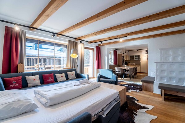 Willkommen im Kuckuck Hinterthal – Apartment Top 3. Diese großzügige Ferienwohnung verbindet modernen Wohnkomfort mit alpinem Stil und bietet Platz für bis zu 10 Personen. Warme Materialien, edles Holz und viel Licht schaffen eine gemütliche Atmosphäre mit authentischem Alpenflair – perfekt für Familien und Gruppen.