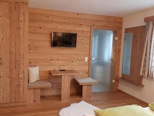 Das Doppelzimmer Morgensonne verfügt über ein großes Doppelbett sowie eine rustikal-moderne Ausstattung. Durch das moderne Badkonzept ist der Sanitärbereich optimal ins Zimmer integriert. Darin befindet sich eine Dusche, ein Waschplatz sowie die Toilette. Hand- sowie Duschtücher liegen für Sie bereit. Der große Balkon lädt mit den gemütlichen Balkonmöbeln zum Verweilen ein. Die wunderschöne Aussicht zur Lindaumauer, in ruhiger Lage, lässt viele entspannte Momente zu.