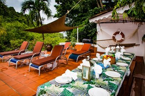 Das Erdgeschoss öffnet sich zum größeren Pool, wo sich ein perfekter Bereich zum Sonnenbaden rund um den Hauptpool befindet, der mit einer Außenbar ausgestattet ist, die einen Kühlschrank, ein Waschbecken im Freien und einen Grill mit Blick auf das Karibische Meer und die kleine Bucht Trou Rolland umfasst.