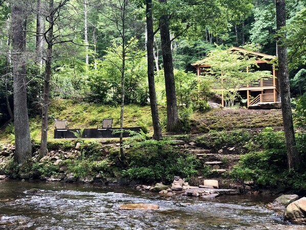 Very private, 7 person Hot tub, fire pit, outdoor living room with fire table, gas grill, river 100 ft from front door, 2.5 mile fly fishing trail across the river from cabin, minutes to hiking Appalachian Trail, custom beds with brand new mattresses on all beds, fully remodeled and super clean! Master bedroom w/ king bed, 2nd bedroom w/ 2 twin beds, 3rd bedroom with 2 queen beds, 3 full baths.