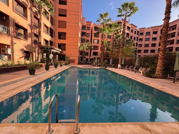 Get ready to relax in this 2-bedroom apartment in Marrakesh. This terrific property offers a tranquil escape with 1 full bed and 1 twin bed, a cozy bathroom with a shower and bidet, and essential amenities like heating, AC, and WiFi. The apartment building features an outdoor pool and a garden. The apartment features a washing machine and a kitchenette with a refrigerator, an oven. Added amenities include a balcony, and a Smart TV. Whether you're exploring the vibrant city or unwinding after a day of adventures, this enchanting apartment is the perfect retreat for guests seeking comfort and convenience. We hope you'll enjoy your stay at our apartment.