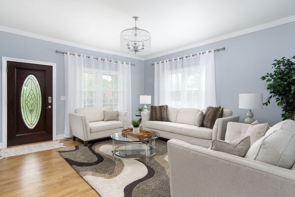 • Living Room & Workspace - Spacious living room with TV & a Dedicated desk and chair area perfect for remote work!