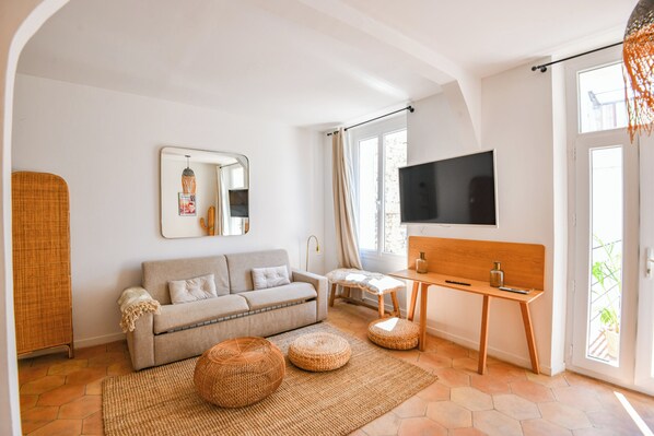 Notre logement de 100 m² est situé Rue Bernard du Bois, au rez-de-chaussée sans ascenseur d'un immeuble ancien refait à neuf en hommage à l'écrivain Marcel Pagnol. Très belle luminosité grâce à sa grande baie vitrée qui donne sur une terrasse avec vue sur Notre Dame de la Garde. Le logement est équipé de la climatisation. À moins de 2 min à pied de la gare TGV Marseille Saint-Charles, tramway et métro, et à 10 min à pied du Vieux-Port. Entièrement rénové par un architecte d'intérieur, il comprend une cuisine équipée ouverte sur un salon et coin repas. L'espace nuit comprend deux chambres avec lits double et des rangements. Salle de bain avec douche, vasque et WC. Localisation idéale proche des transports, de la gare Saint-Charles et du quartier du Panier. Restaurants, commerces et cafés à proximité.