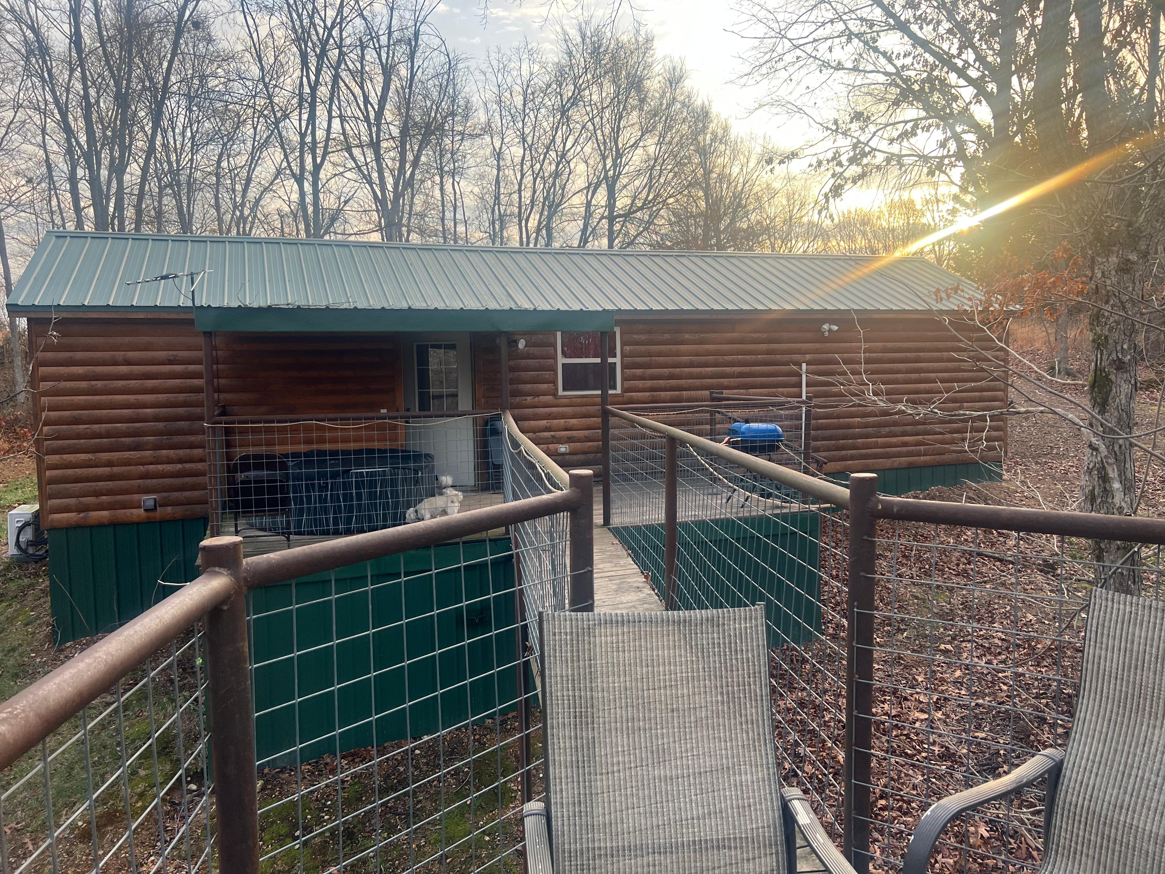 Very clean comfortable fully furnished 2 bed room 1.5 bathrooms 616 sq. ft. cabin ( Sleeps about 6 ) with a HOT TUB ,full size bed in West bedroom, sliding oak barn doors through out. Combination living area and full kitchen with all of your pots , pans and skillets . Cook stove, refrigerator, microwave, toaster coffee maker , can opener, exc. with vaulted reclaimed barn tin covering the ceiling with a sofa bed. Large cedar main bathroom , with jacuzzi style tub with jets and a shower . Full size washer and dryer. All towels and wash cloths furnished. East bedroom has a vaulted ceiling and a queen size bed. All bed linen is furnished. Back deck must be seen to be appreciated it is parsley covered with a table and chairs to set in and HOT TUB to relax in . With an open area for the furnished charcoal grill or to just sit in the sun . (Now for the fun part ) off of this deck there is a 20 ft. walk way that leads back into the woods out to another deck ( about 20 ft. up into the trees) . This area is perfect for watching the abundant animals and birds , drinking you morning coffee or putting up a hammock ( please bring your own hammock) to relax in or sleep under the stars. With a big front yard, picnic table, fire pit with plenty of room for the kids and pets to run and play. All located on a working Buffalo Farm only about 20 minutes from the world famous Buffalo National River. If you need more cabins or to read some of our great reviews Check out Lofted cabin on a buffalo farm # 1366488 or Cedar cabin located on a buffalo farm near the Buffalo National River . #1364965 All stays come with a FREE tour of the farm!! See you soon !!