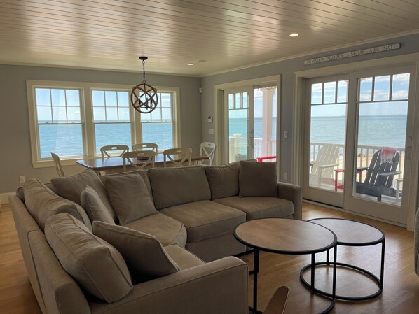 The large open main living area also has 270-degree water views from Kitchen, Dining and living Room spaces. A wall of sliding glass doors opens to the side deck with Adirondack chairs for you to relax in with your afternoon beverage of choice!