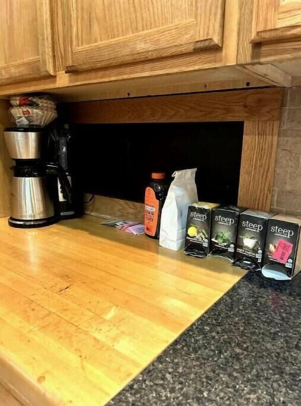 The kitchen features a counter-top stove, in-wall oven, and commercial grade microwave! Our fridge is stocked with fresh water for you as well! All pots, pans, and utensils are included!