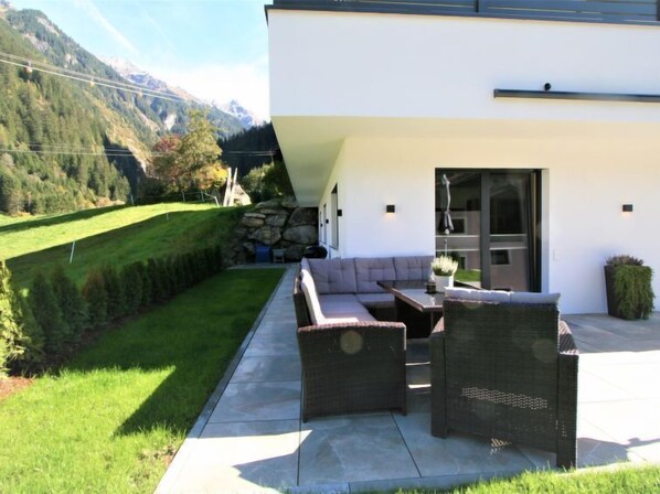 Sehr modernes, freistehendes Zweifamilienhaus "Haus Goldmann", Baujahr 2022. Im Ort Ginzling, 9 km vom Zentrum von Mayrhofen, exzellente Lage: Absolut zentral und dennoch ruhig. Zur Alleinbenutzung: Garten (eingezäunt). Terrasse, Gartenmöbel, Grill. Im Hause: Zentralheizung, Skischuhtrockner. Parkplatz (für 2 Autos). Supermarkt 9 km, Restaurant 50 m, Bushaltestelle "Ginzling Naturparkhaus" 250 m, Bahnstation "Mayrhofen Bahnhof" 5.5 km, Freibad 9 km, Hallenbad 9 km. Wanderwege ab Haus 50 m, Skilift 200 m, Skibushaltestelle 150 m. Bekannte Skigebiete sind gut erreichbar: Ski Zillertal 3000 9 km, Zillertal Arena 19 km, Hintertuxer Gletscher 23 km. Bekannte Seen in der Umgebung sind gut erreichbar: Schlegeis Stausee 12 km.