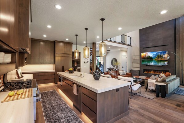 The chef's kitchen comes fully stocked with an espresso machine, blender, toaster, dishwasher, and two full-size washer/dryer units for ultimate convenience. Outside, enjoy the propane BBQ, fire pit, and a seating area nestled among the pines.