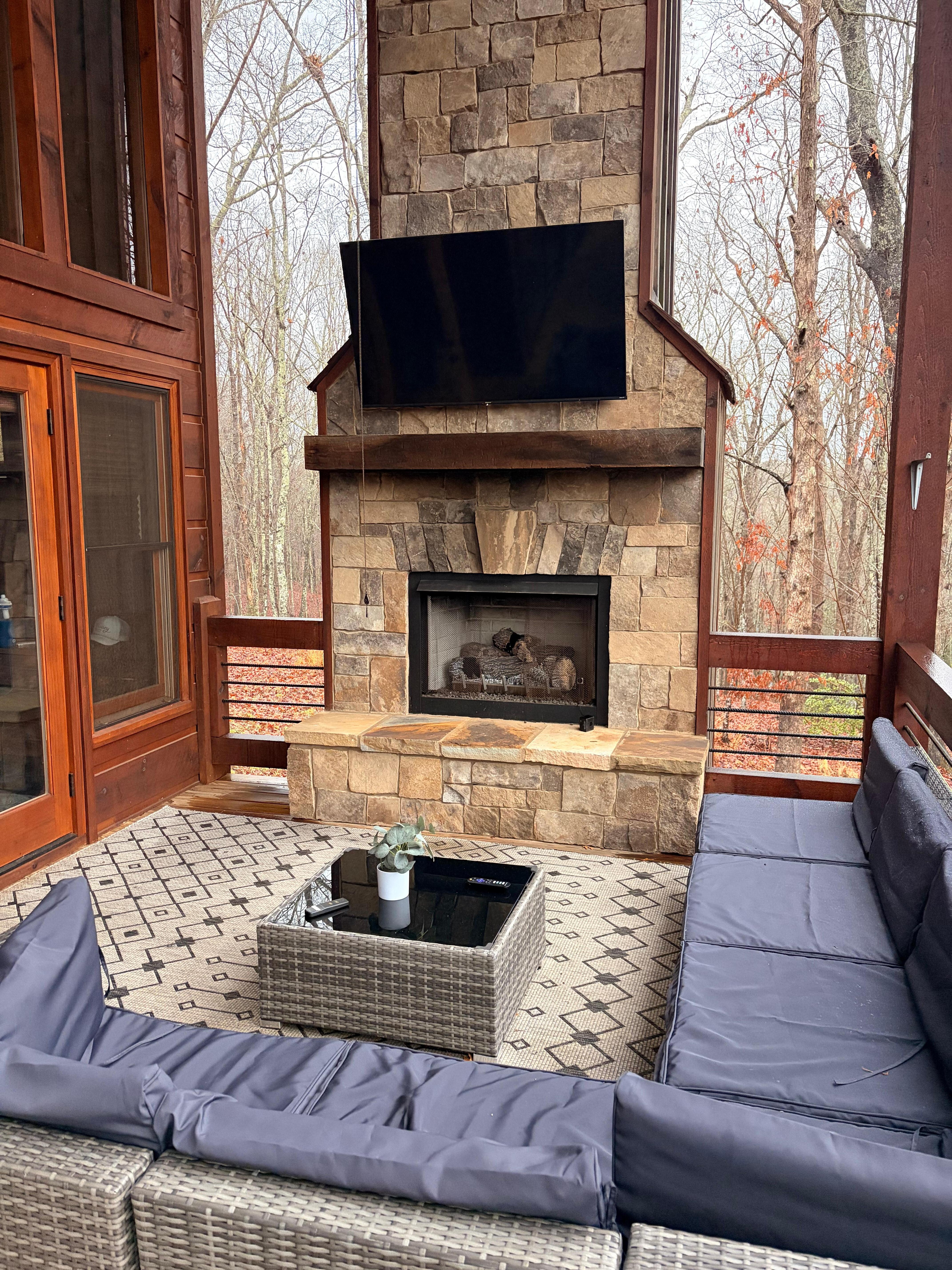Located about 4 minutes from downtown McCaysville and about 16 minutes from the Wal-mart at Blue Ridge for reference. The cabin Rustic Moderns and is upscale using quality high end materials throughout. There is a large carport at the entrance which was appreciated when it rained during our stay. The kitchen has gorgeous granite countertops, a gas cooktop and oven as well as a microwave and large refrigerator. It also has a large farmhouse sink, a huge island with seating, and there is plenty of storage. There is not a dining table inside the cabin, but there is a nice large table on the deck on the main level. There are 2 bedrooms with kingsized beds and attached baths on the main level.The shower area in the main master bedroom is huge with 2 high pressure shower heads and a large soaker tub. There are 3 fireplaces. The 2 on the main level are gas the one on the lower level is wood burning. The downstairs deck area is very nice and huge. It is screened in, with a ping pong table, dart board, large jacuzzi tub and wood burning fireplace with plenty of seating. You will need to grab some wood in town if you intend to use this fireplace. We bought some at the IGA in town and the Home Depot in Blue Ridge. There is a bedroom and bath as well as a bar on the the lower level. Note you will have to use the exterior stairs to access the lower level areas. Overall we really enjoyed our stay. It is peaceful, comfortable, and convenient for our stay.