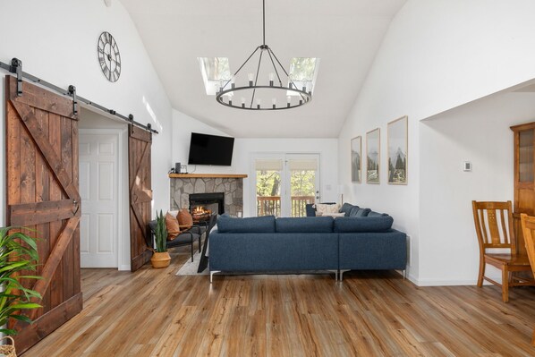 The CubHouse has 2 levels. The main level features a large living room with a comfortable sectional couch, electric fireplace, 55” smart TV, kitchen, balcony with seating, large 10-seat dining table for family dinners and game nights, and 3 bedrooms/2 bathrooms. The primary bedroom has a queen bed, 43” smart TV, dresser, office desk, walk-in closet, and ensuite bathroom. Additional bedrooms include queen beds, dressers, and brand new 43” smart TVs.