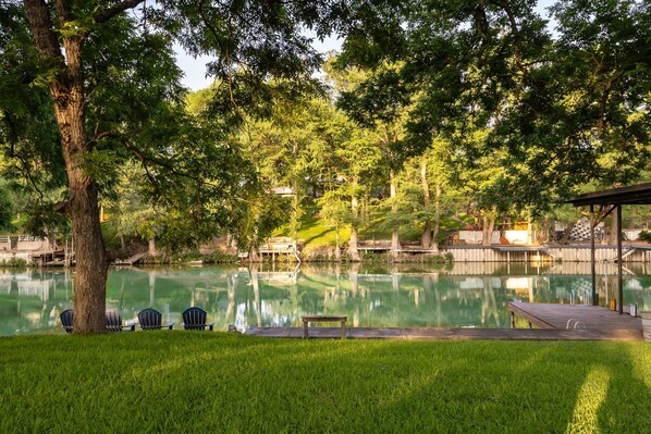 Host a one-of-a-kind Guadalupe getaway at this 5-bedroom, 4-bath vacation rental ON THE WATER with space for large groups. It's perfect for multiple families, reunions, and retreats. The Guadalupe Lake Lodge leaves nothing to be desired - from the open floorplan, vaulted ceilings, large bedrooms, high-end furnishings, and water views, to the breezy, 1-acre lot leading right down to the private lakefront. Lounge under pecan trees, swing your feet off the dock, cook burgers on the grill and relax - your dream vacation awaits at The Guadalupe Lake Lodge!