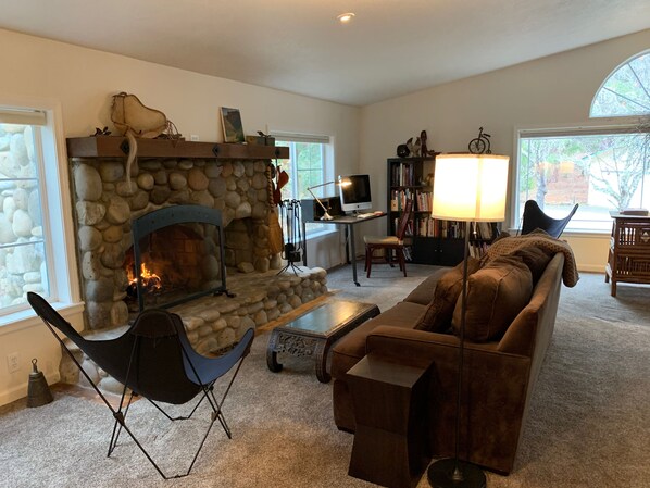 Dieser Rückzugsort am Rogue River befindet sich in einem privaten und abgeschlossenen, 19 Hektar großen Waldgebiet an einem 600 Fuß langen Flussufer. Der offene Grundriss, die großen Fenster und die Gewölbedecken sorgen für einen hellen und luftigen Wohnraum. Die Veranda erstreckt sich über die gesamte Länge des Hauses und bietet einen spektakulären Blick auf den Rogue River. Das Wohnzimmer verfügt über Parkettböden, einen schönen Kamin und ausreichend Sitzgelegenheiten sowie einen 50-Zoll-Breitbild-HD-Fernseher, einen DVD-Player und Sat-TV.