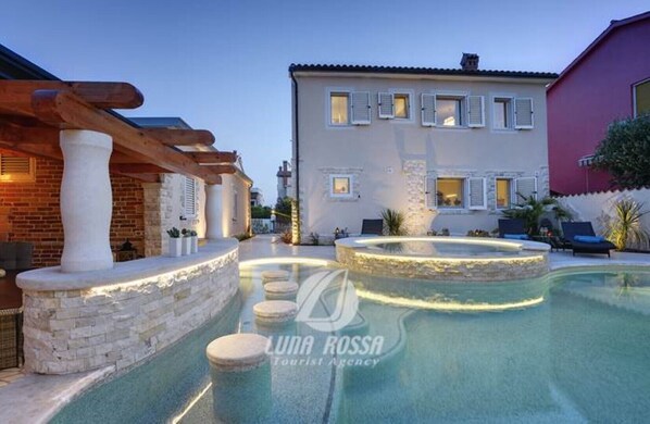Dieses wünderschӧne Ferienhaus mit privat Pool befindet sich im Medulin, nur 600m von Sandstrand. Es wurde 2016 komplett renoviert. Diese Villa besteht aus zwei Objekte, das grossere Objekt besteht aus vier Schlafzimmern, Badezimmern, Wohnbereich, Kuche. Die kleinste Häuschen am Pool besteht aus ein Schlafzimmer, Badezimmer und Wohnbereich mit Schalfkautsch. Alle Räumen würden neu und sehr modern geställtet und verfügen uber eine Klimaanlage. Diese schӧne Ferienhaus Villa Sonja ist ideal einen gemeinsamen Urlaub von Familien oder Freunden. Auf der überdachten Terasse mit Grillkamin konnen Sie den Blick auf dem Pool mit Hydromassage und Poolbar genniesen. Sie können Ihr Haustier mit in den Urlaub nehmen, da Haustiere willkommen sind!