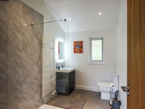 Separate Toilet.. Oil central heating, electricity, bed linen, towels and Wi-Fi included. Initial fuel for wood burner included. Highchair, available on request. Welcome pack. Enclosed decking area. Hot tub for 4 (private). Private parking for 2 car. No smoking. Please note: This property is located on a working farm.. Oakwood Lodge is located within a mile of the peaceful village of Meifod, a picturesque rural community nestled in the scenic Vyrnwy Valley, and it’s a welcoming retreat, purpose-built with holiday comfort in mind. Decorated in a stylish, contemporary finish, it features an open-plan living space with a handmade kitchen, dining area, and lounge that flows out onto a private terrace. Suspended on stilts, the terrace gives spectacular views across the lake and surrounding countryside and comes complete with a bubbling hot tub to enjoy after a day’s exploring.