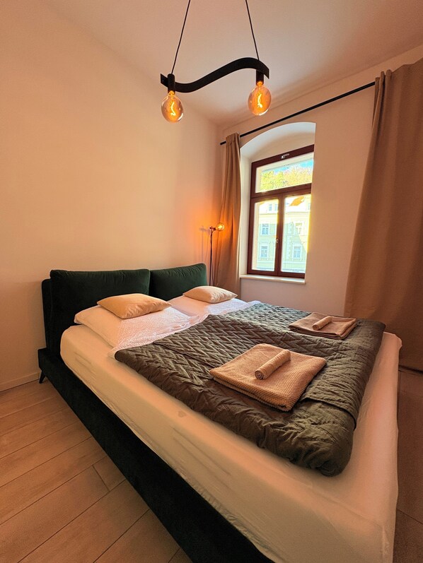 Das separate Schlafzimmer ist ruhig gelegen und geschmackvoll eingerichtet. Ein komfortables Doppelbett, hochwertige Bettwäsche und eine angenehme Beleuchtung sorgen für erholsamen Schlaf. Die klare, reduzierte Gestaltung schafft eine entspannte Atmosphäre, ohne dabei kühl zu wirken. Zusätzlich kann der Wohnbereich als weiterer Schlafplatz genutzt werden, wodurch die Wohnung flexibel belegbar ist.