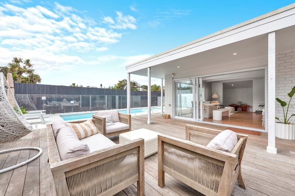 A gorgeous decked backyard with BBQ and outdoor furniture